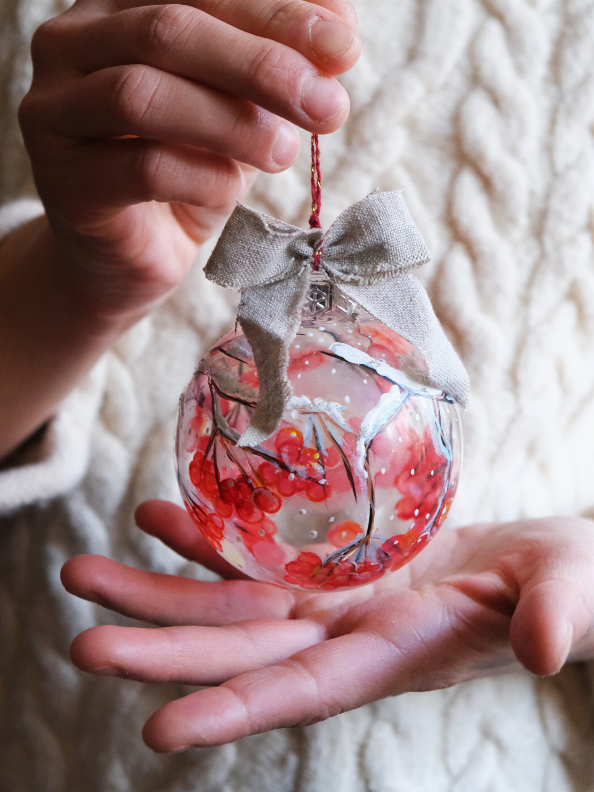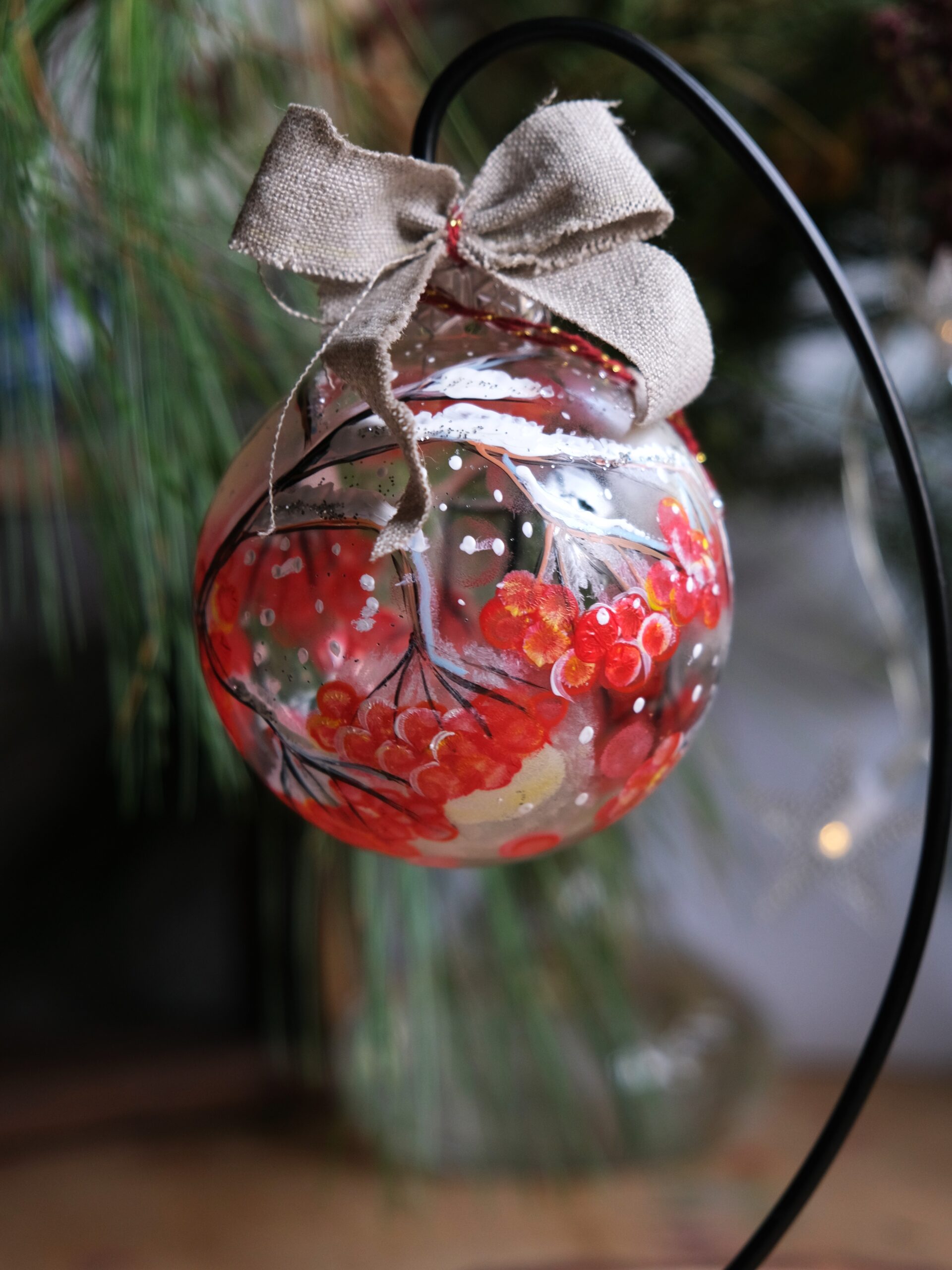 Ręcznie malowana szklana bombka z kaliną obsypaną śniegiem
